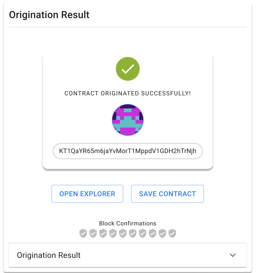 The "Origination Result" section shows information about the deployed contract, including its address:
