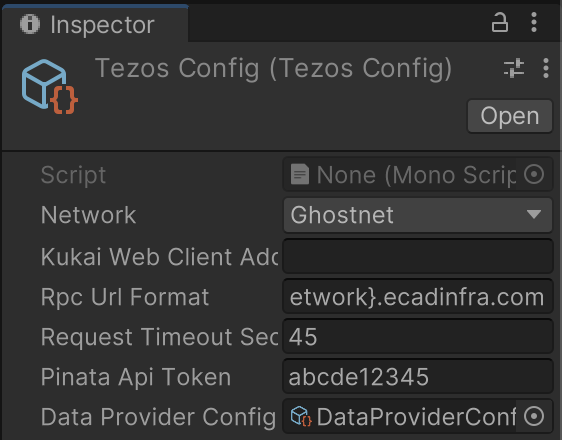 If you need to change the RPC node that the SDK uses, such as if the default node is overloaded or if you are ready to send transactions to Mainnet, you can set the RPC node by editing the TezosConfig scriptable object at Assets/Tezos/Resources/TezosConfig.asset and setting the RPC URL in the Rpc Url Format field, as in this picture: